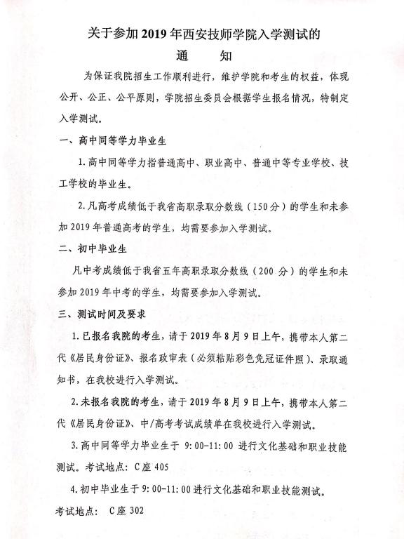 關(guān)于參加2019年西安技師學(xué)院入學(xué)測試的通知