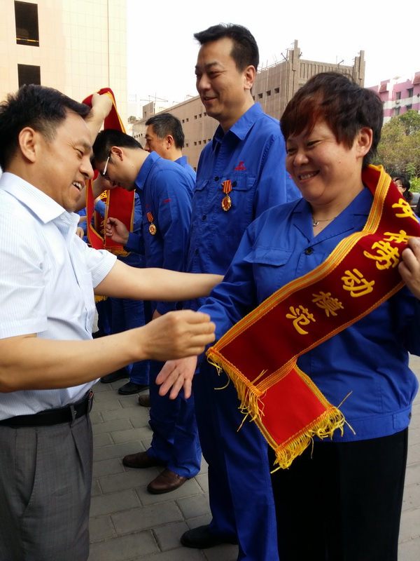 中國西電集團(tuán)經(jīng)理助理丁小林為楊兵披上西安市勞動(dòng)模范綬帶